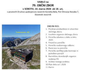 Vljudno vas vabimo na Občni zbor PD Javornik-Koroška Bela, ki bo v soboto, 14. 03. 2026, ob 18. uri, v prostorih Društva upokojencev Javornik Koroška Bela (Pot Otmarja Novaka 7, Slovenski Javornik).