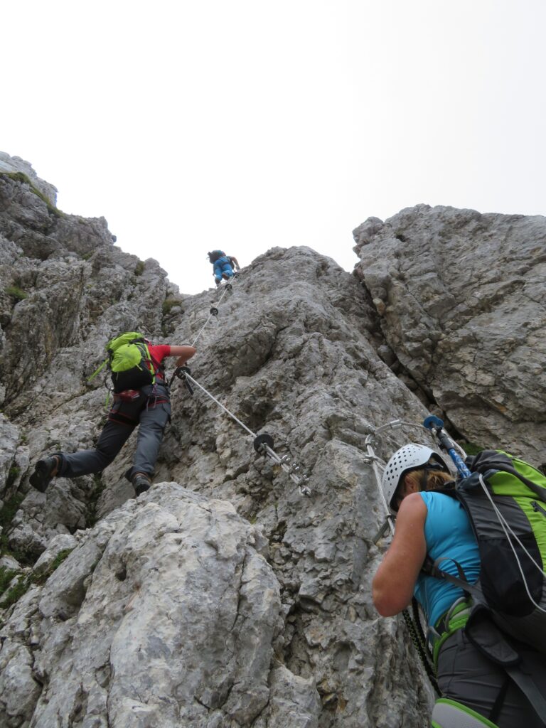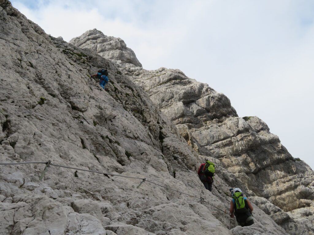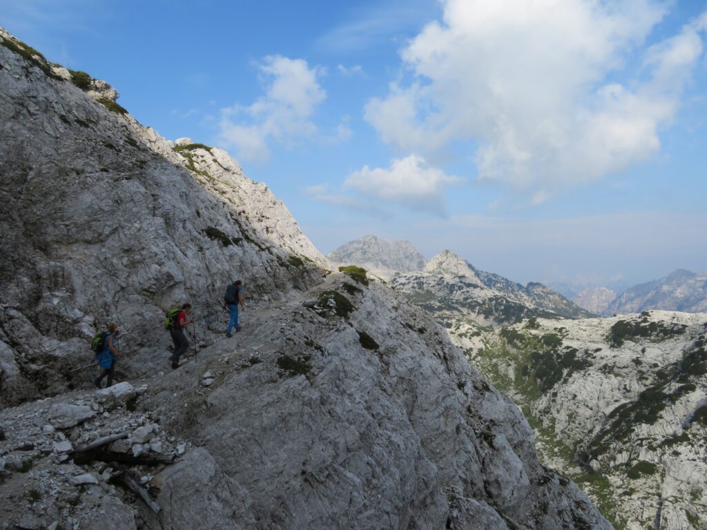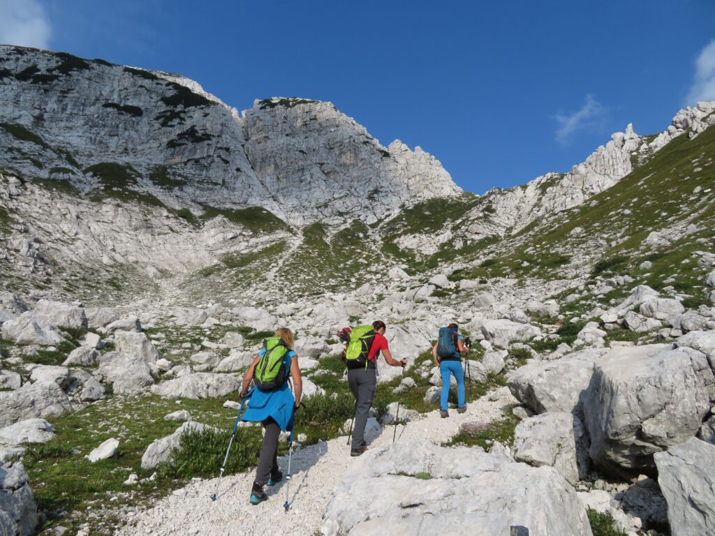 Ob sedmi uri zjutraj smo se zbrale same pohodnice in se odpeljale mimo Rateč in Trbiža na Nevejski preval. Gondola je pričela obratovati ob pol deveti uri, zato smo zaradi zgodnjega prihoda nekaj minut morale še počakati. Pri koči Gilberti se nismo ustavljale, načrt je bil, da si privoščimo kavo na povratku. Zlagoma smo nadaljevale pot, postopoma so se nam odpirali razgledi na prostrane kaninske pode in hitro je minila hoja po mulatjeri do severne stene Kanina, kjer se prične ferata Julija. Opremile smo se s pasovi in samovarovalnimi kompleti ter nadaljevale po ferati, ki je bila pred nekaj leti opremljena s popolnoma novimi jeklenicami. Ferata je kratka, tako da smo bile v manj kot uri na grebenu in nato kmalu tudi na vrhu. Udeleženke pohoda smo se med seboj že poznale s prejšnjih pohodov, tako da smo se odločile, da ne sestopimo po slovenski strani mimo postaje D, ampak po ferati Rosalba, ki čez Vrh Krnice pripelje do bivaka Marušič na italijanski strani kaninskih podov. Pot je tam bolj izpostavljena, manj opremljena z jeklenicami, poleg tega te čaka še vzpon na Vrh Krnice. Hodile smo bolj pazljivo in počasi ter naposled varno prispele nazaj na izhodišče. V koči Gilberti smo si privoščile pivo, kavo in štrudelj, nato pa se srečne, da nad Kaninom ni deževalo, z gondolo vrnile v dolino in nato nazaj proti Sloveniji.