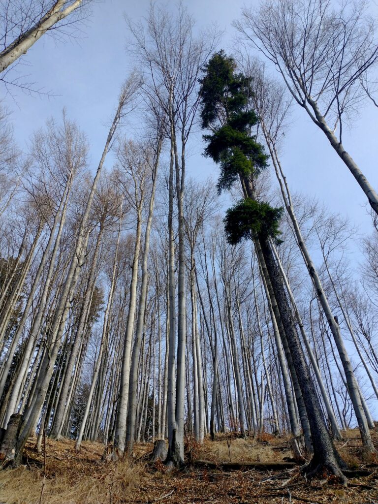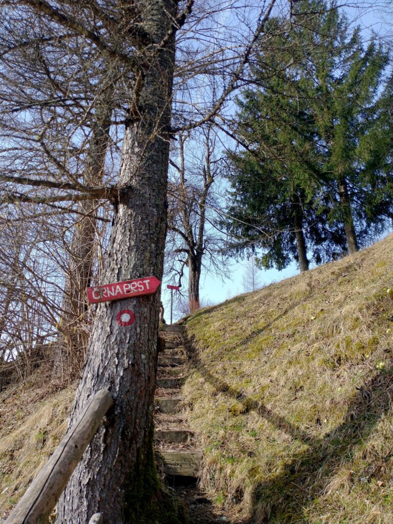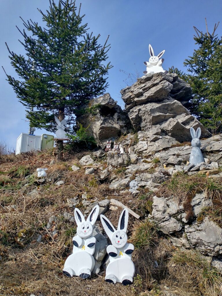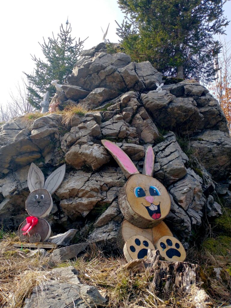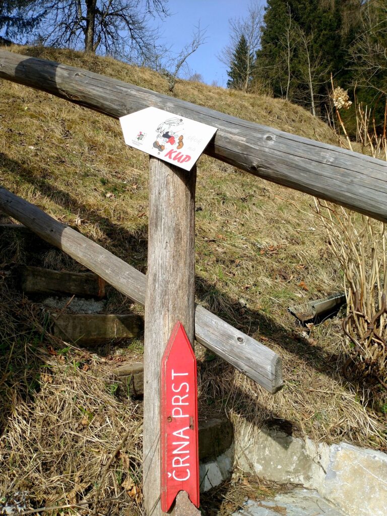 S Petrovega Brda smo se v smeri proti Črni prsti povzpeli na nižje ležeči vrh Kup, kamor vsak obiskovalec lahko prinese svojega zajčka. Z vrha je lep razgled na Porezen in na gore nad Soriško planino vse do Črne prsti.